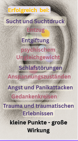 NADA wird weltweit in Entzugs- & Suchteinrichtungen eingesetzt, weil es das vegetative Nervensystem beruhigt, Suchtdruck reduziert und Entzugssymptome abmildert.